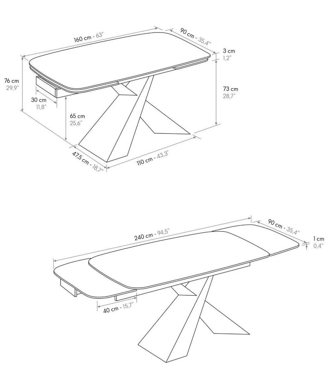 Tavolo di Design con gamba in metallo a forma di X con finitura bronzo, il piano opaco con angoli arrotondati in ceramica finitura Bianco arabesco con 2 allunghe integrate estraibili anche singolarmente da 40 cm ciascuno.